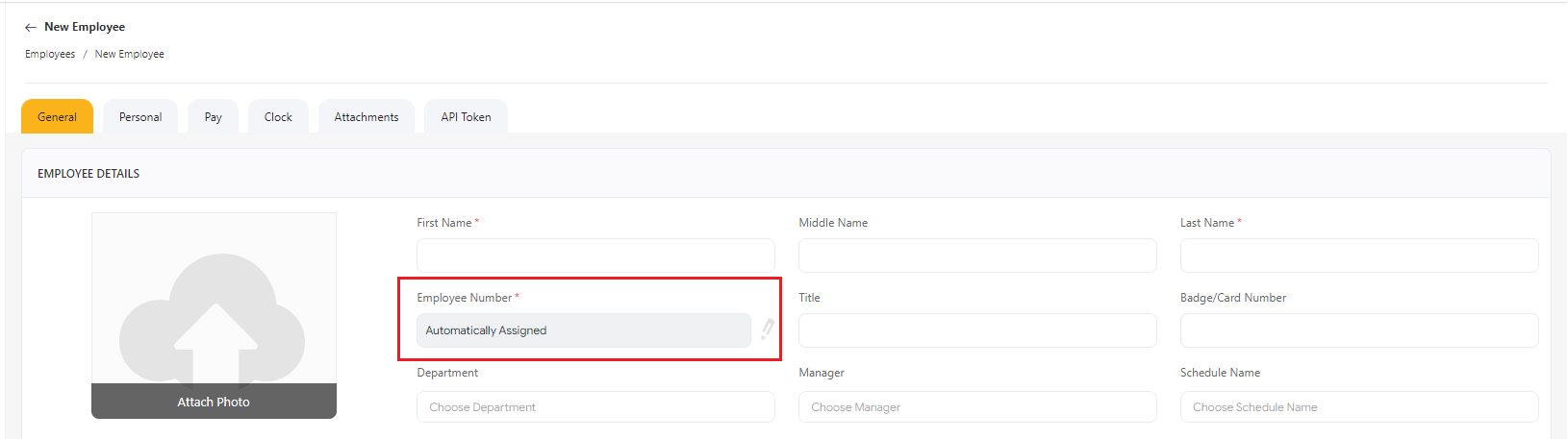- Example - To verify, access the new employee screen. The employee number field will be read-only and have the label "automatically assigned".