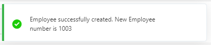 On saving, the employee number appears on the success message.