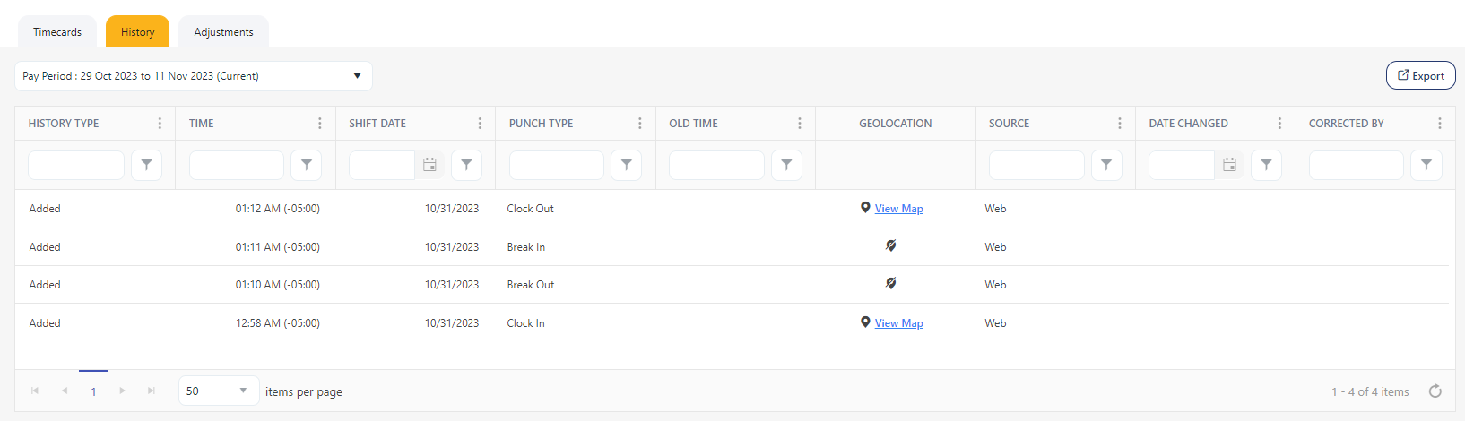 After the location access is granted and when you clock in or out, location information becomes accessible. To view the location information, go to the "Timecards > History tab" or "View Timecards > History tab" and click on the View Map link.