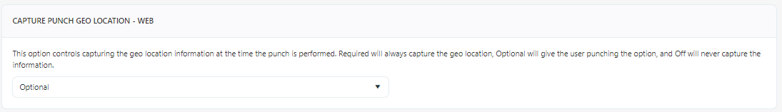 1. Select Capture Punch Geo Location. The Capture Punch Geo Location settings allow for capturing the geo location information when performing a punch. Select the option: