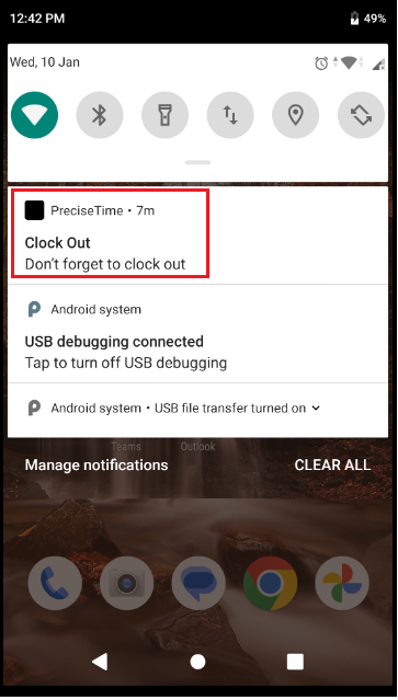 1. Note that the user will receive a reminder to "Clock out" in the mobile notification section. The mobile notification section often appears at the top of your screen. To access it, swipe down from the top of your screen. It will show the notification panel, displaying your recent notifications and alerts.