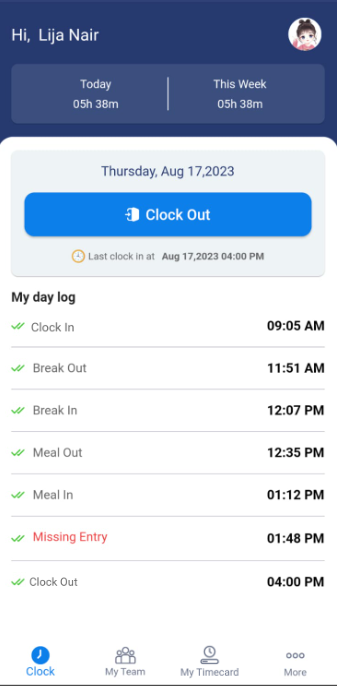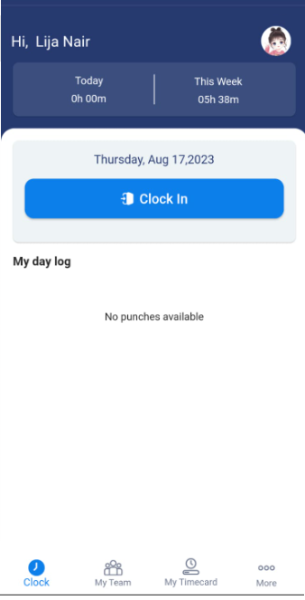 The Clock screen provides essential information about yourself, your total logged hours on a particular day and for a week, a provision to clock in and clock out, and ultimately, a time record for the currently logged-in day.