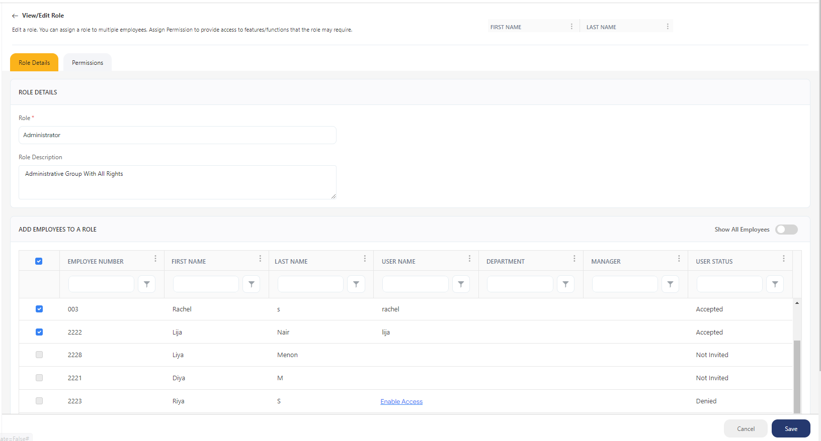 Note: An employee can have only one role. The checkbox will be disabled for employees who are not invited or with no application access.
