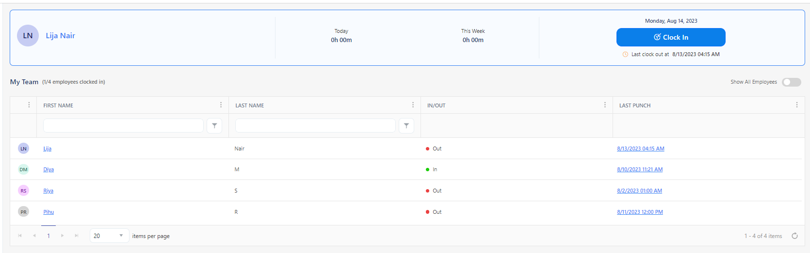 - The Clock In/Clock Out button will be shown only for the employee who has web punch permission.