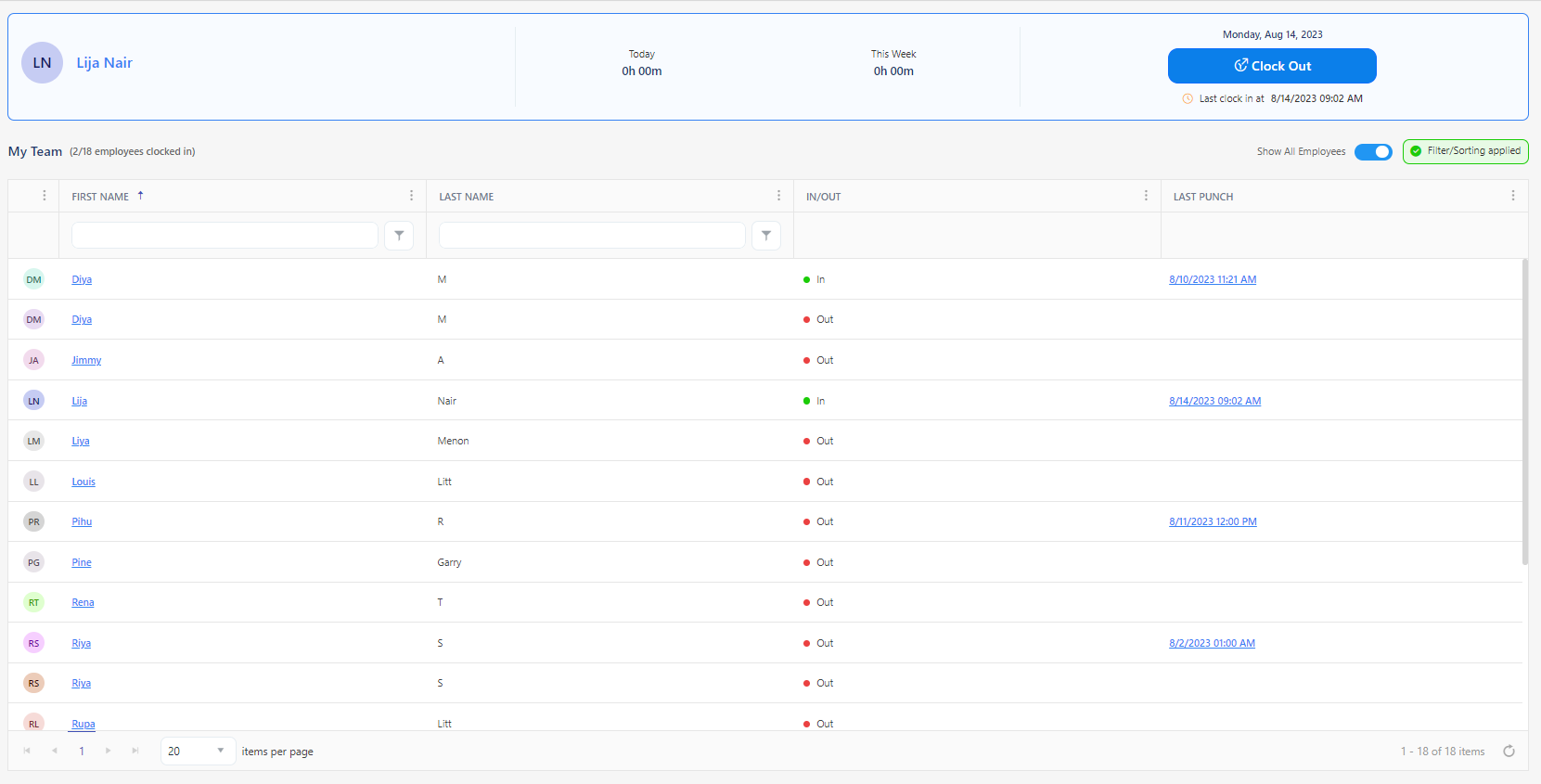 - My Team - This section is dedicated to displaying information about your team. This includes the count of employees clocked in, names, profile pictures, last punch, and in/out status of your team members, allowing you to see who is currently working or available.