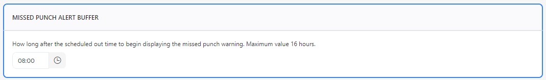 Missed Punch Alert Buffer is the duration during which the missed punch warning is shown after the scheduled out time. The maximum allowable duration is 16 hours.