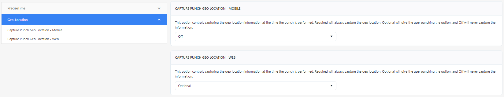 1. The Capture Punch Geo Location settings control capturing the geo location information at the time the punch is performed. Select one of the options: