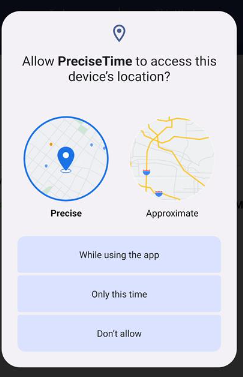 2. Example - To verify, consider that the capture punch geo location is set to "Required". Access the mobile application. Try to Clock In. A popup message will appear with the message "Allow PreciseTime to access this device's location? - While Using the app, Only this time, or Don't allow".