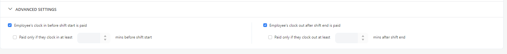 - Employee's clock in before shift start is paid - The checkbox will be checked by default. Keep it checked if you want the employee to be paid if they clock in before their actual shift start time. Uncheck to disable the settings.