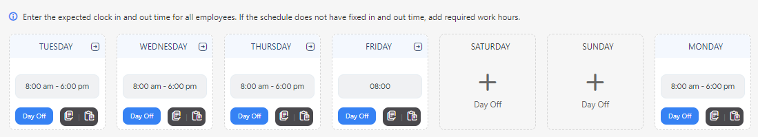 Enter the expected clock in and out time for all employees. Add the required work hours if the schedule does not have fixed in and out time. Note that you can set the first day of the week in the Pay Period Settings screen.