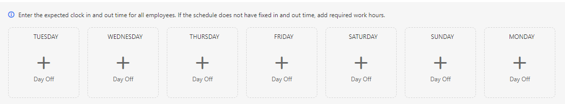 - Initially, you will see a Plus button on all days. The Plus button indicates Day Off.
