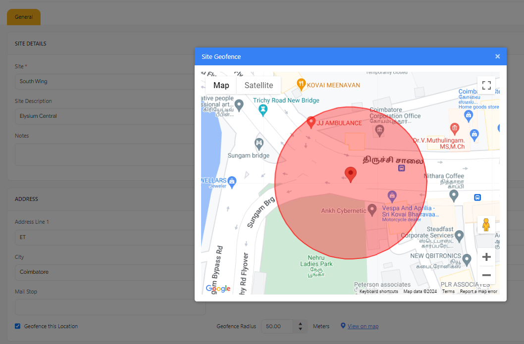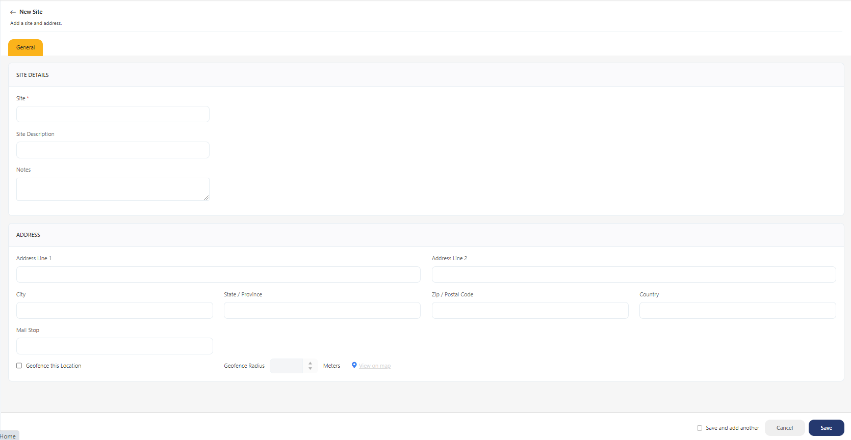 - Check the checkbox to add a geofence to the site. Selecting the checkbox will enable the Geofence Radius field.