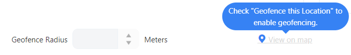 - Once the 'Geofence this Location' checkbox is selected, enter the geofence radius. Note: The geofence radius ranges from a minimum of 30 meters to a maximum of 80000m (49.72 miles), with a default radius of 50 meters.