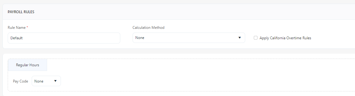 Note: Make sure that you define and associate all Pay Codes with the respective Payroll Rules prior to users beginning to clock in or punch in on the product. The application includes a default payroll rule, and it is important that once you have added all Pay Codes, you access the payroll rules screen to modify the default Payroll Rule. This modification should include the assigning pay code for regular hours and, if necessary, for overtime. Additionally, keep in mind that you have the option to create a new payroll rule if needed.