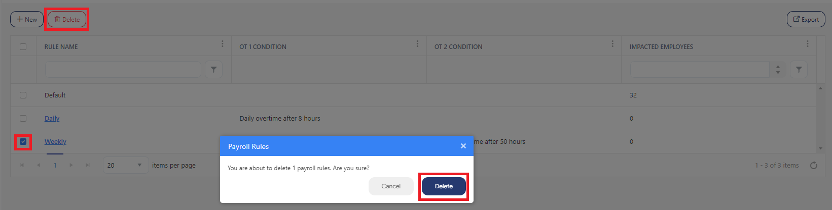 1. Delete - The Delete button allows you to delete one or multiple payroll rules.