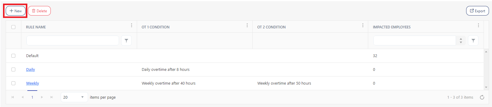 1. New - This button allows you to add a new payroll rule. To add a new Payroll rule, click on New. Refer to the New Payroll Rule topic.