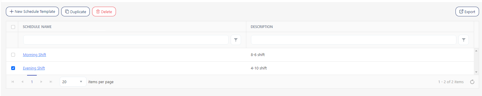 Click on the Export button to download the list of schedule templates.