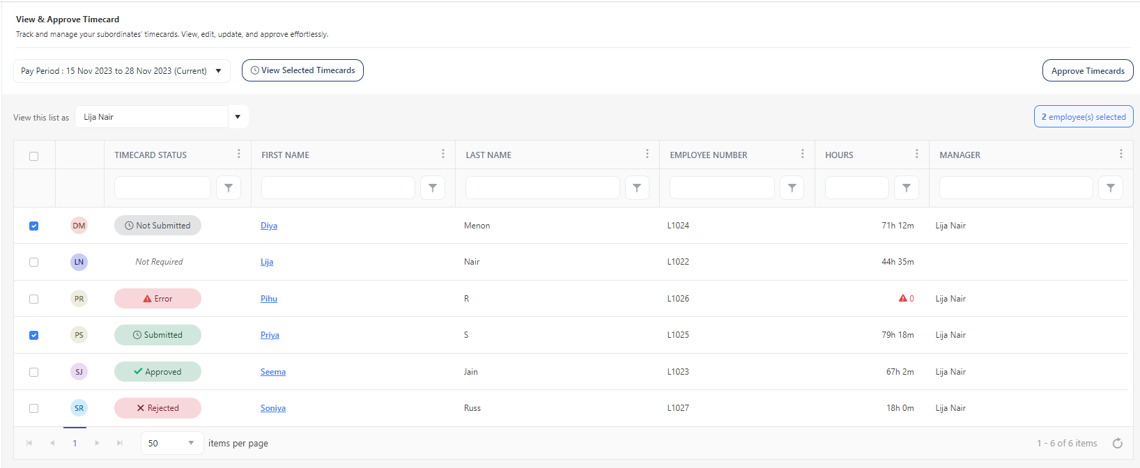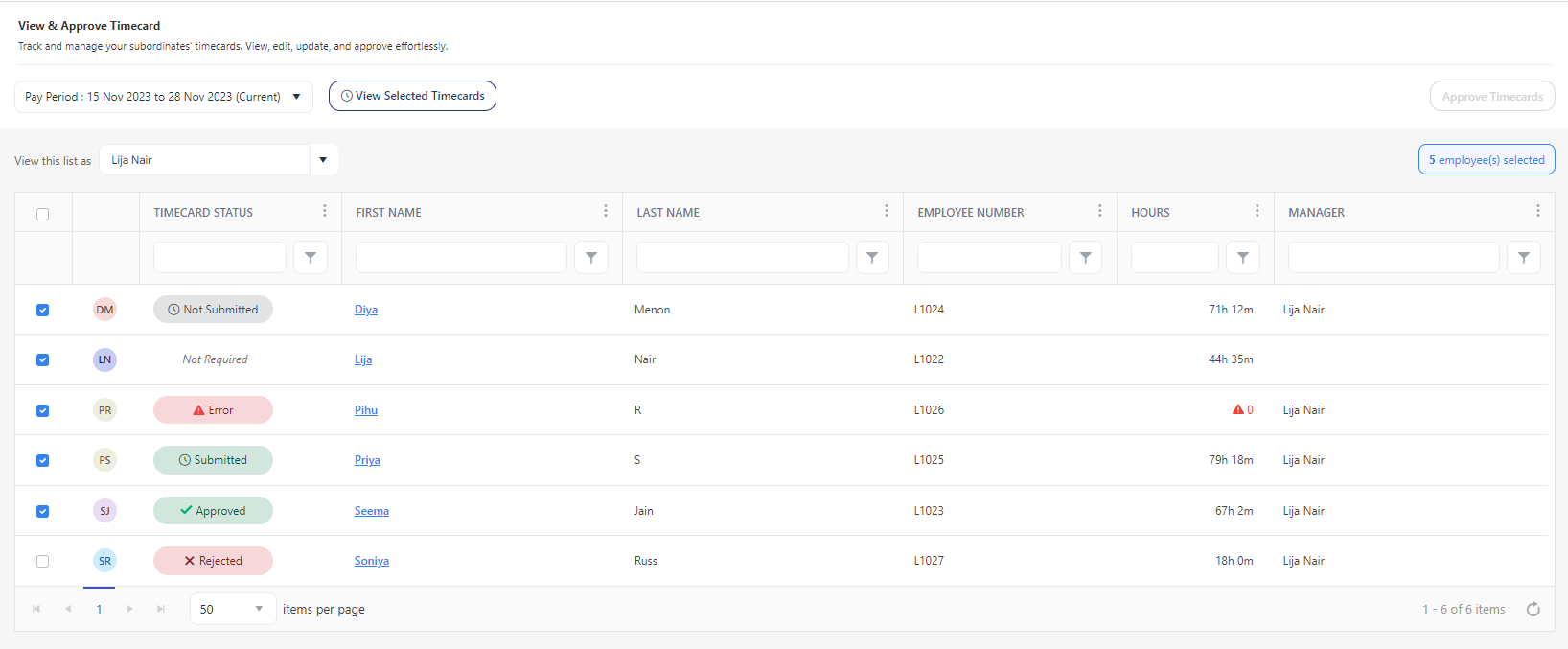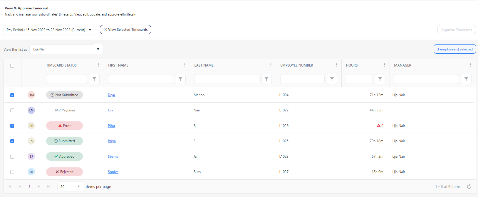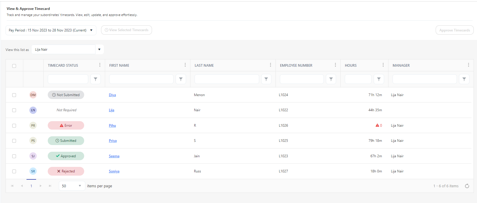 The View Timecards screen on the View and Approve Timecards lists subordinates reporting to you. It will display their names, employee number, timecard status, and hours. Any discrepancies in the total hour will be shown in red color with a