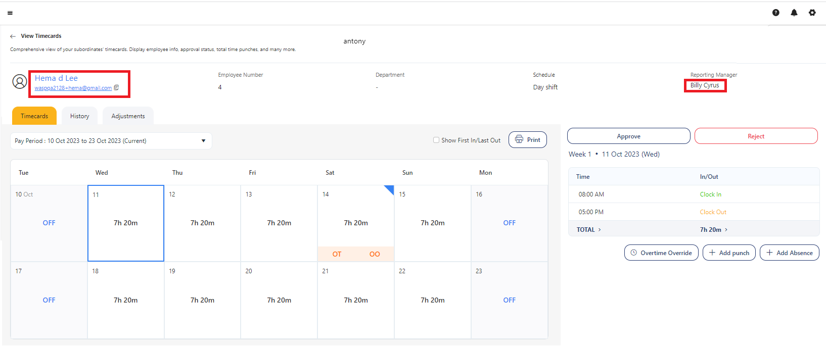 - Antony will view Hema on the View & Approve timecard list and will be able to approve Hema's timecard.